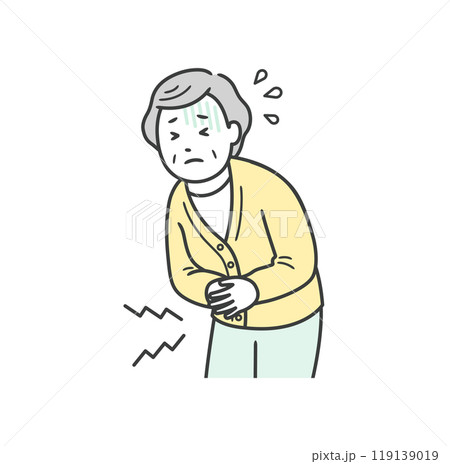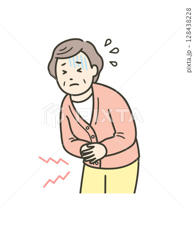 腹痛でお腹を押さえて苦しむ高齢女性のイラスト
