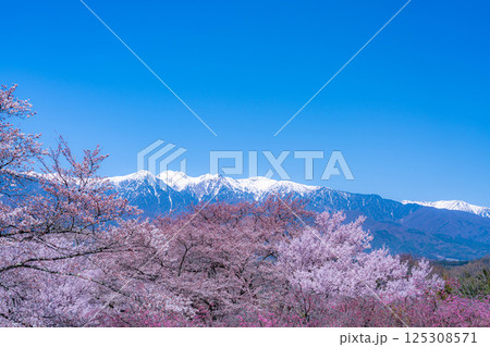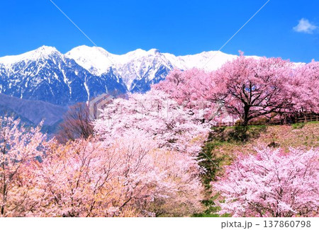 【桜素材】大草城址公園から見る桜と残雪の中央アルプス【長野県】