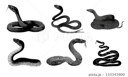 Snake logo. Icon anima Asian New Year symbol. Silhouette sign, nature graphic black tattoo. Element tropical dangerous serpent with scale, tongue viper, python. Vector drawing design, isolated set
