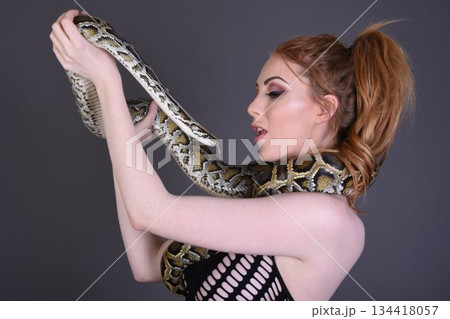 Woman poses gracefully with a snake while wearing stylish lingerie
