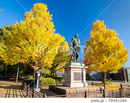 11月東京・台東区 上野公園の西郷隆盛像とイチョウ