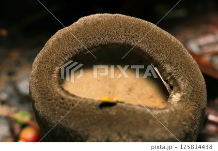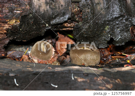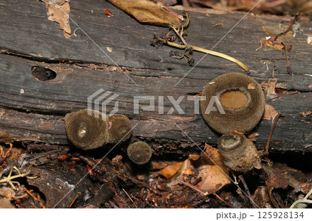 黒褐色の大きなすり鉢状のオオゴムタケキノコ(自然環境下菌・キノコ類ストロボマクロ撮影)