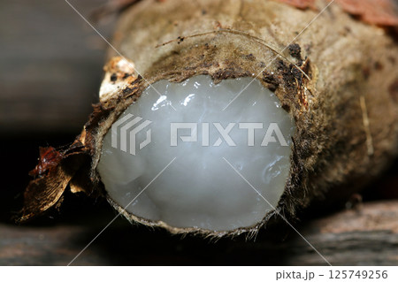 全身毛深いオオゴムタケ茸の可食部となる半透明な寒天質な内部アップ(自然環境下ストロボマクロ撮影)