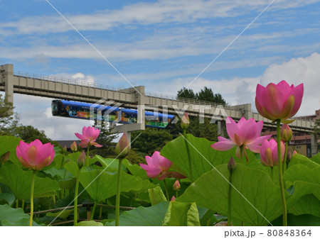 千葉公園、大賀ハスの花とモノレール(7月)千葉県千葉市