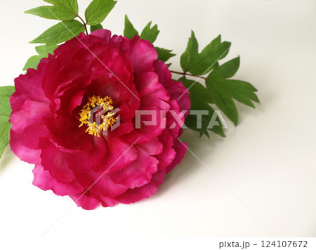 白背景に一輪の牡丹の花、赤い牡丹の花