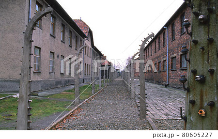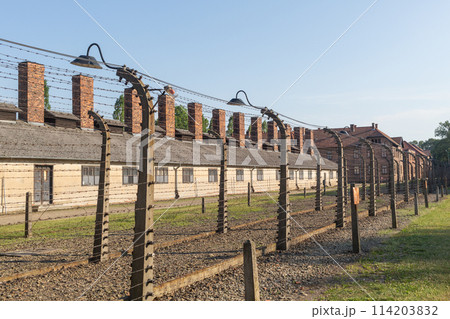 【ポーランド】アウシュビッツ・ビルケナウ強制収容所の有刺鉄線のフェンスに囲まれたレンガ造りの建物