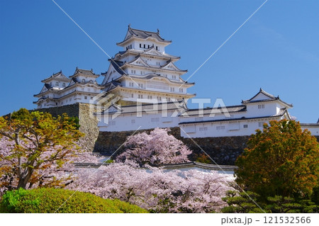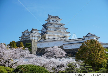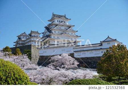 姫路城榎下門跡付近から望む青空を背景にした姫路城天守閣と桜の風景 Ver5