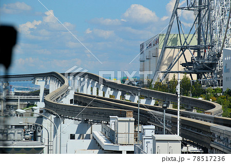 大阪モノレール万博記念公園駅から本線と彩都線のモノレール独特の分岐をみる 背景に観覧車