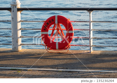 大阪港の岸壁に設置された「大阪港湾局」と書かれた赤い救助用救命浮環(水難事故防止・安全対策)