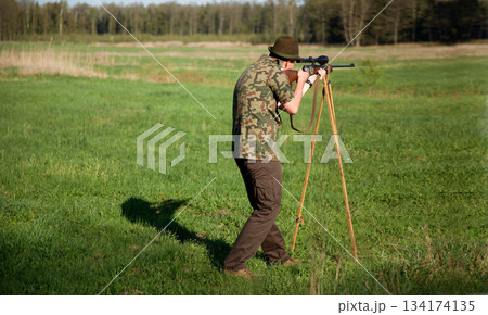 Hunter, gun and man in field in nature on a Africa safari for animal shooting with a weapon on vacation. Hunting sport, male person and target hunt practice of a traveler in camouflage with a scope