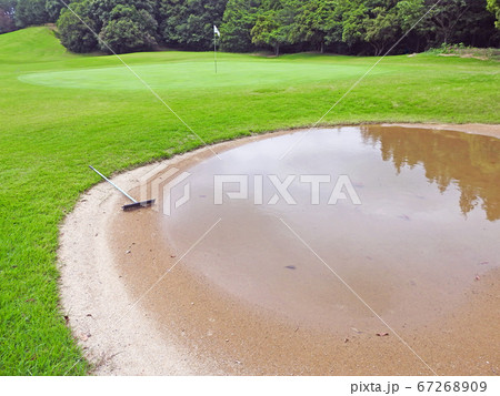 梅雨時雨上がりのゴルフ場バンカーは水溜り