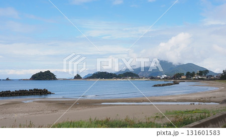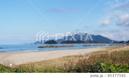 城山海水浴場の砂浜の波打ち際と若狭湾の風景。福井県大飯郡高浜町。