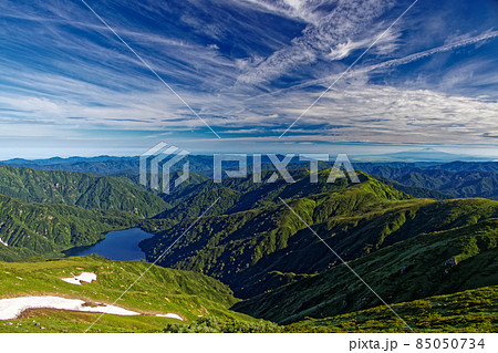 朝日連峰・以東岳山頂から見る大鳥池・日本海
