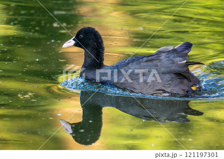 The Eurasian coot, Fulica atra swimming on the Kleinhesseloher Lake at Munich, Germany