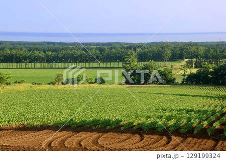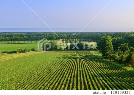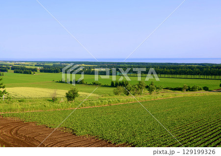 畑とオホーツク海(北海道・斜里町)