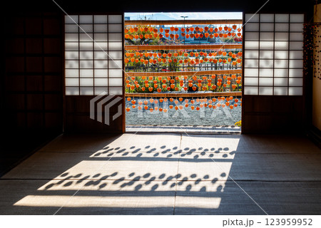 (山梨県)旧高野家住宅(甘草屋敷)座敷から見る、軒先のころ柿