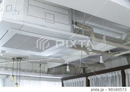 Ceiling air conditioning system, open-air, circulating air throughout the modern style, popular installed in coffee shops. Ceiling mounted cassette type air conditioner in the cafes.
