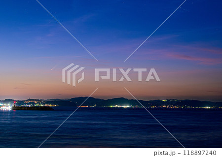 紫金山・アトラス彗星が夜明け前に湘南の海に昇る