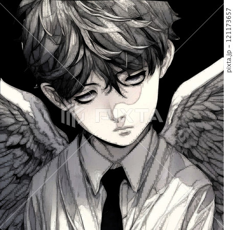 【イラスト素材】堕天使キッズ3/少年/男の子/切ない/翼/悲しい/モノクロ/かわいい/エンジェル