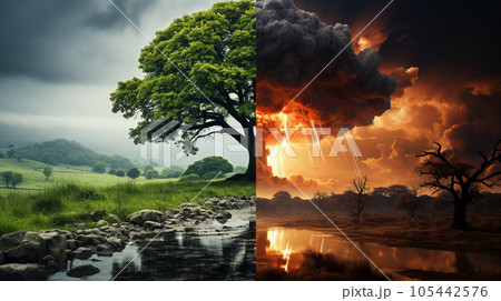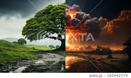 聞いて極楽見て地獄:極楽と地獄、極端な対比。巨大な樹木「バオバブ」と「核爆発のキノコ雲」の対比で。