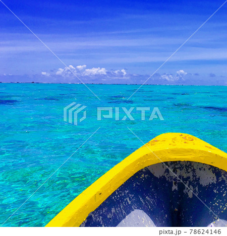 【鹿児島県奄美群島】与論島のエメラルドグリーンの海を行く黄色いボート