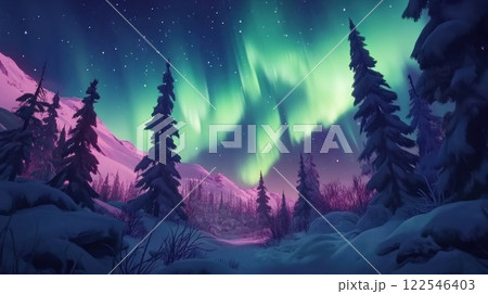 Magical aurora borealis illuminates snowy mountain valley at night.