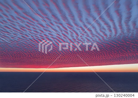 Pink and Blue Undulating Cloudscape Over Calm Ocean at Sunset
