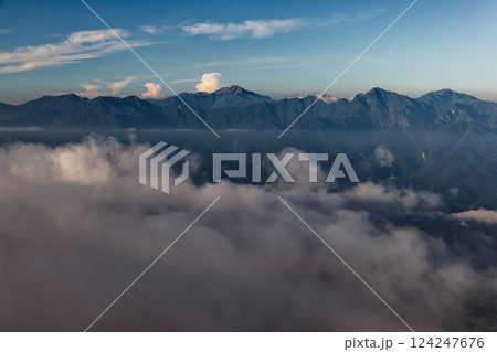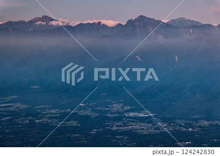 八ヶ岳連峰・前三ツ頭から見る朝日差す中央アルプス