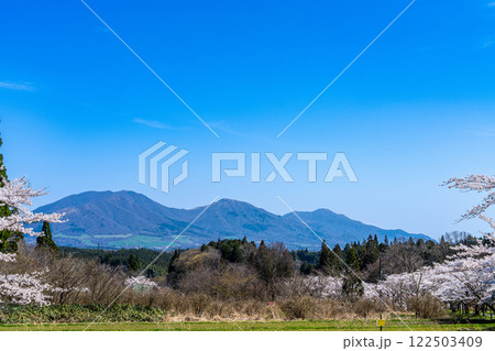 茅部神社から見たソメイヨシノの花と蒜山三座8 岡山県真庭市