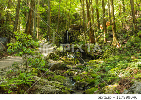 三重県志摩市磯部町にある天の岩戸を流れる小川と境内の風景