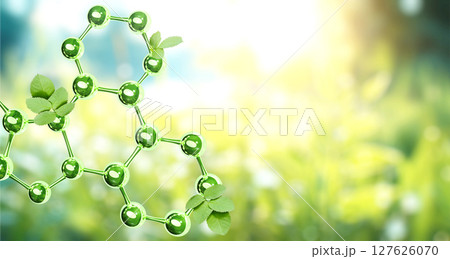 Horizontal sunny background with organic molecular structure with green hues and leaves. 3d glass atom model with leaf. Ecology, go green, Green Energy, environmental, conservation protection concept