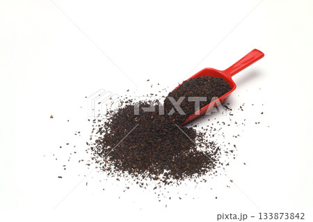 Dried black tea leaves in scoop isolated on white background.
