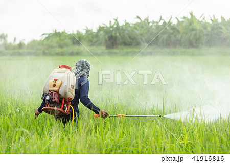Farmer with machine and spraying chemical to young green rice field