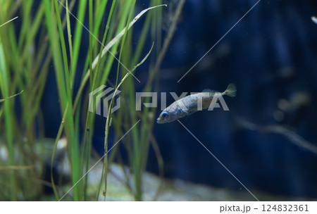 Melanotaenia australis, rainbowfish swimming in aquarium pool with green seaweed