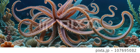 Fairy tale Magnificent octopus among the underwater picturesque landscape with marine life. Fictional sea creature. AI