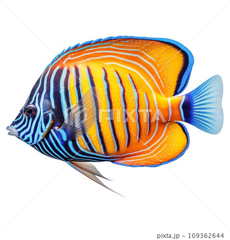 Multicolored aquarium fish on a transparent background, side view. The Tang, an yellow and blue saltwater aquarium fish, isolated on a white background, a design element for insertion