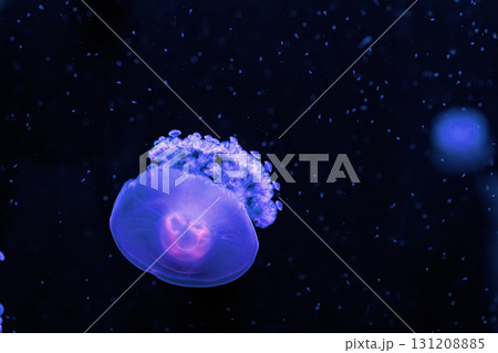 Mediterranear jellyfish, Cotylorhiza tuberculata or fried egg jellyfish swim in blue aquarium water