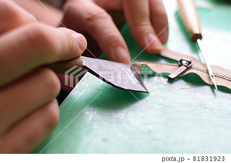 レザークラフトの道具と茶色のレザーバッグ 革細工