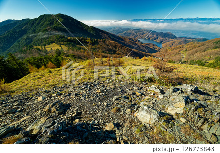 大菩薩連嶺・天狗棚山から見る紅葉の大菩薩湖と甲府盆地・南アルプス