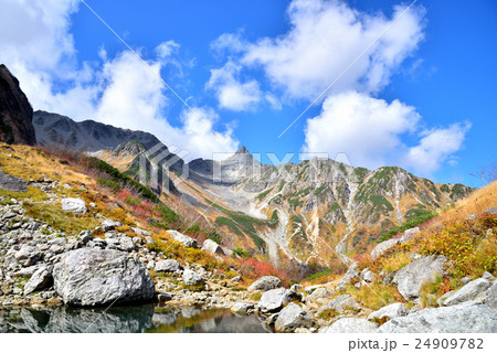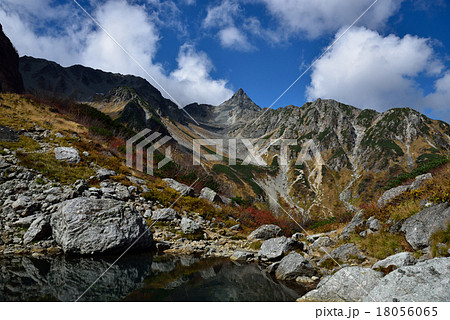 北アルプス 晩秋の槍ヶ岳 天狗池に映る逆さ槍