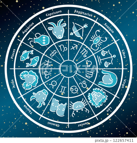 星空と十二星座の星座線のセットイラスト 青い星空の背景 ホロスコープ 星座
