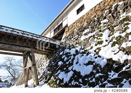 滋賀 彦根城 雪化粧した天秤櫓と廊下橋