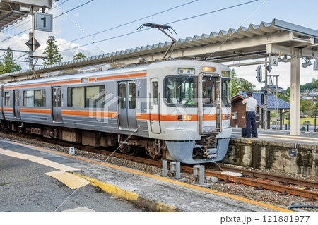 飯田市、天龍峡駅のプラットホームと停車中のJR東海313系電車