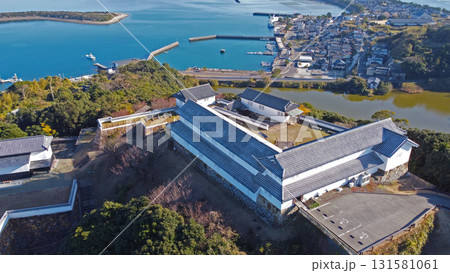 熊本県天草郡苓北町 天草四郎が率いる一揆軍の猛攻撃にも落城しなかった富岡城の遠景と麓の神社の鳥居