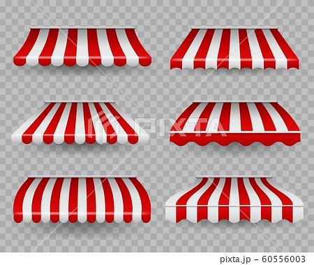 Realistic shop awning tents set. Outdoor market canopy roof for cafe, store front and shop. Tent