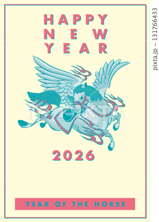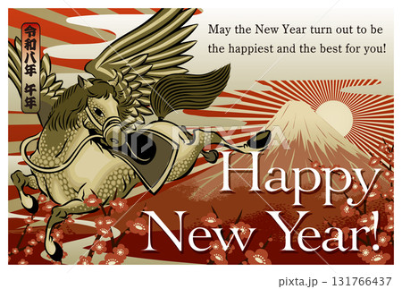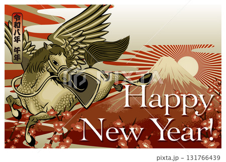 2026年賀状テンプレート「ゴールドペガサス」ハッピーニューイヤー 英語添え書き付パターン