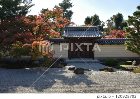 秋の等持院 方丈南庭 モミジと勅使門(京都市北区)
