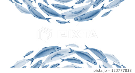 Sardine fish in a semicircular frame swimming in a shoal stylized watercolor illustration on a transparent background for fish restaurants, websites, posters, fish markets and stores