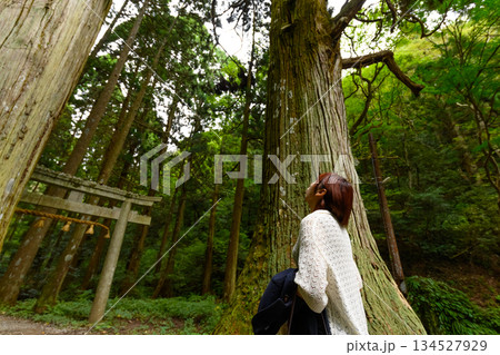 巨木を見上げる森林浴をする女性