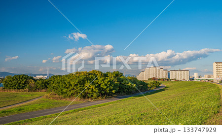 淀川の堤防と夏空風景